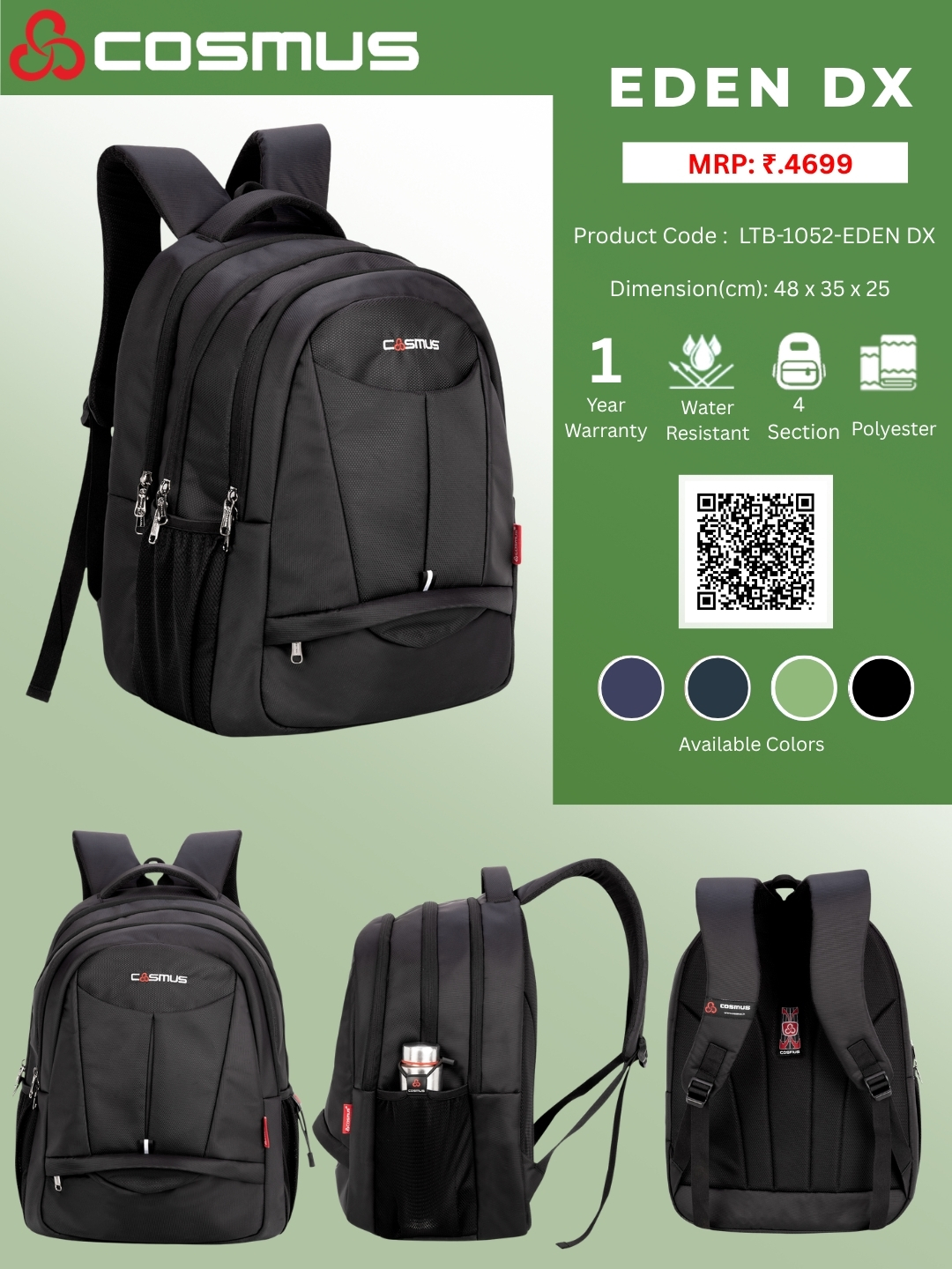 Cosmus Eden Dx laptop backpack is perfect laptop bag for you, its cushioned laptop pocket keep your laptop securely tight and protected while you are on the move. This laptop bag pack suits your style & is very comfortable to carry, its ergonomics and makes you forget the load you are carrying, well-padded shoulder straps ease the carrying