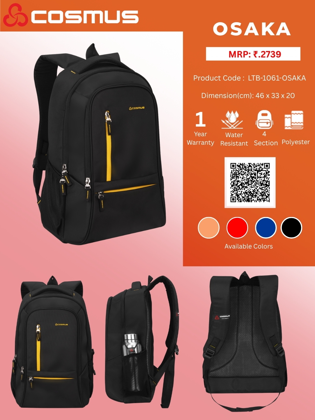Stylish and Durable Spacious Laptop Backpack for Travel Cosmus Osaka15.6 inch laptop backpack is made of High grade water resistance PU coated polyester material that gives it strength and makes it durable for long-term use.