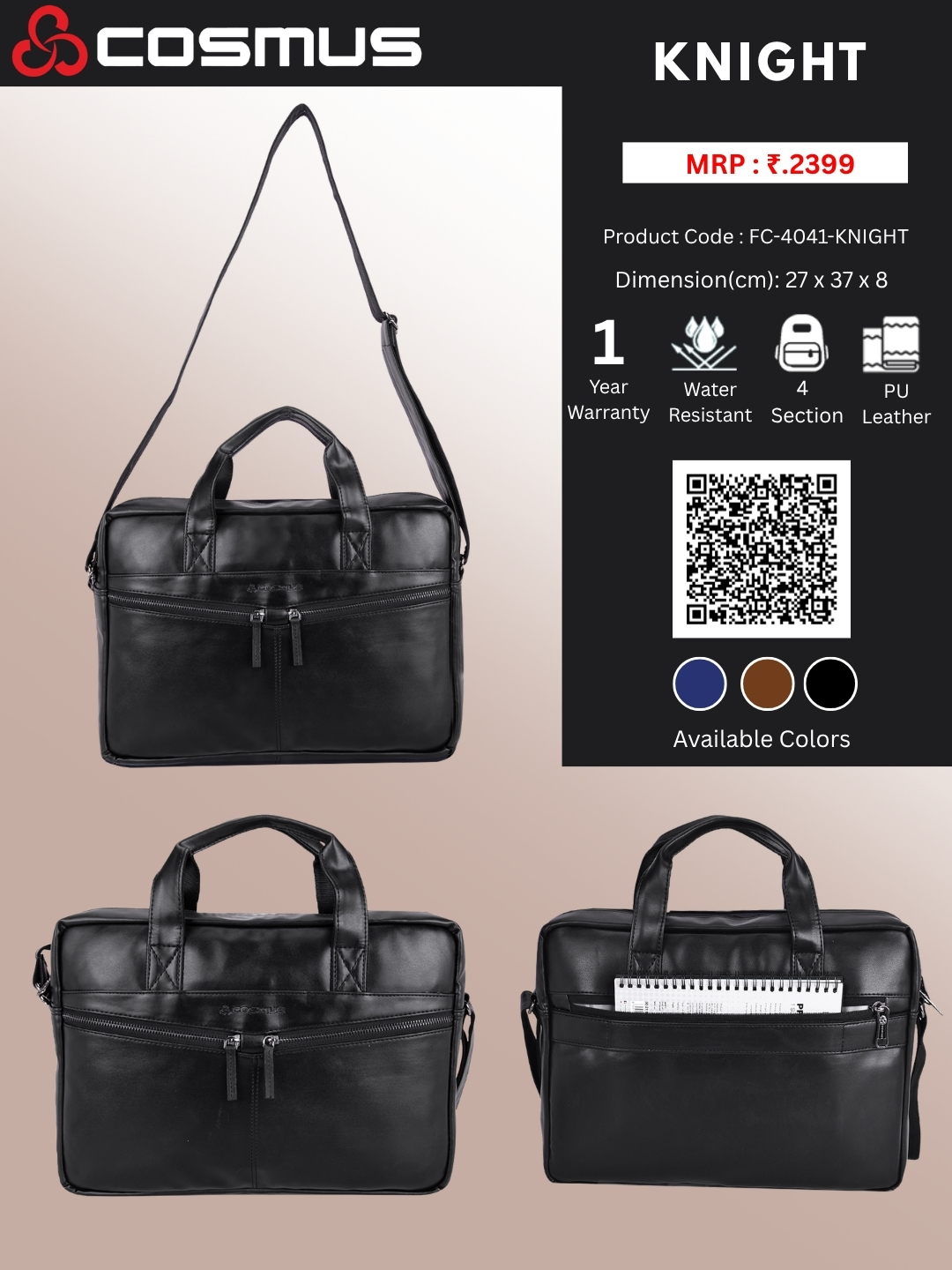 The Knight has one full size main compartment with two front zipper pockets & a back compartment. This bag also features a padded laptop sleeve & a small inner zipped compartment for all the necessities you will need.