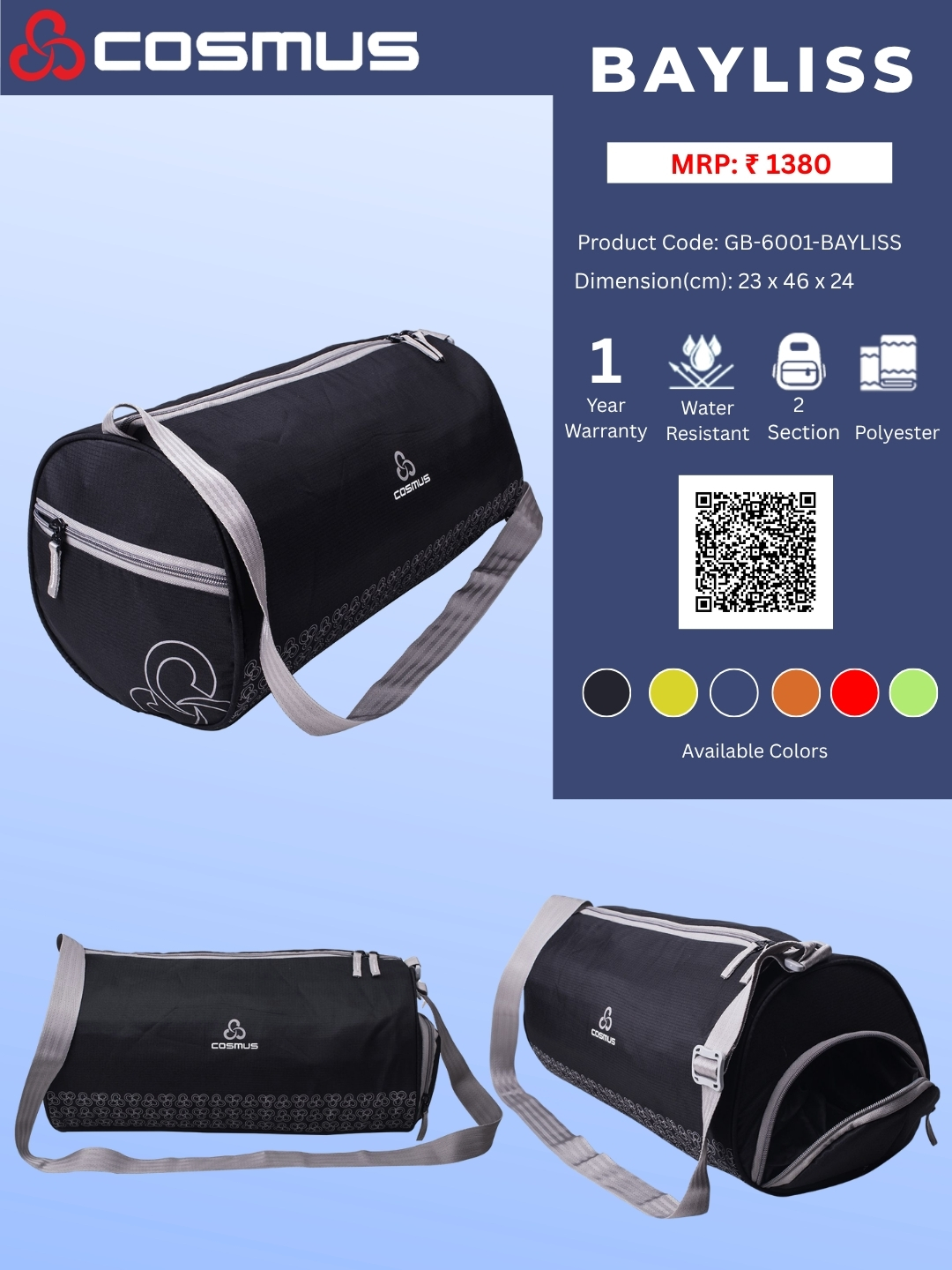 The Cosmus Bayliss Sports Bag combines style and functionality effortlessly. With its sleek design and choice of colors, it adds a touch of sophistication to your athletic ensemble. The bag is not only suitable for the gym but also doubles as a travel bag or weekend getaway companion, ensuring you're always prepared for your next adventure.