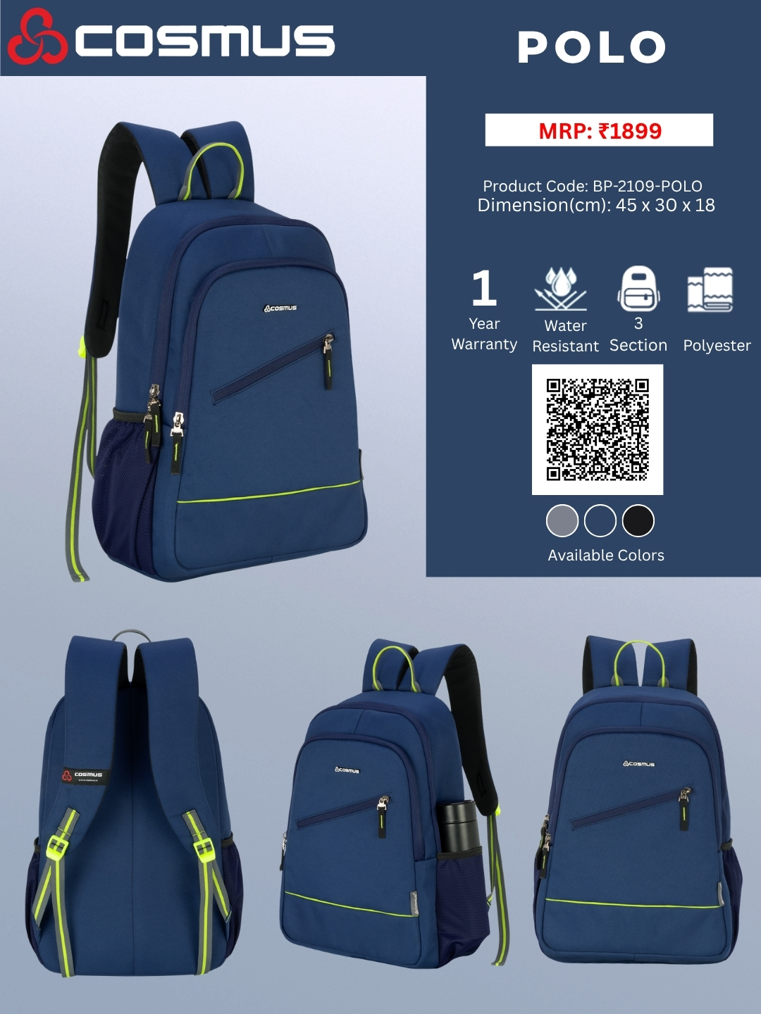 Available in navy blue, grey, and black, the Cosmus Polo backpack combines functionality with style, allowing you to choose a color that best suits your personal taste.