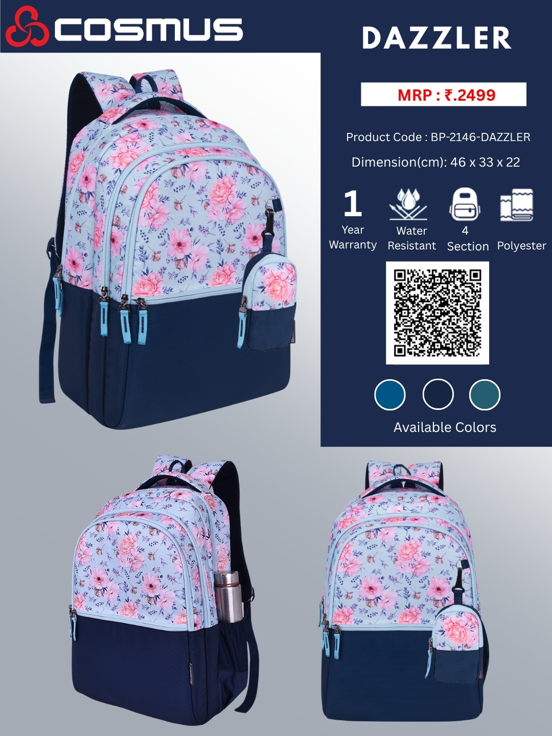 Fashionable Appeal: The Cosmus DAZZLER Navy 32-liter Girls School Backpack exudes style with its trendy pink color and sleek design, appealing to students who prioritize both fashion and functionality.