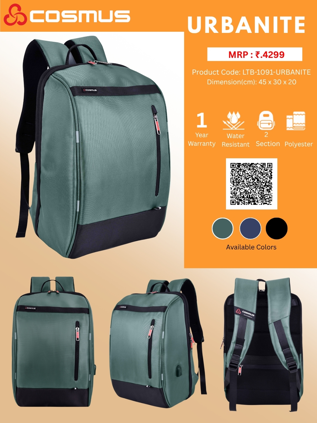 Secure & Spacious Storage – Dedicated padded laptop compartment for up to 16” laptops, an external USB charging port, and multiple pockets to keep essentials within reach.