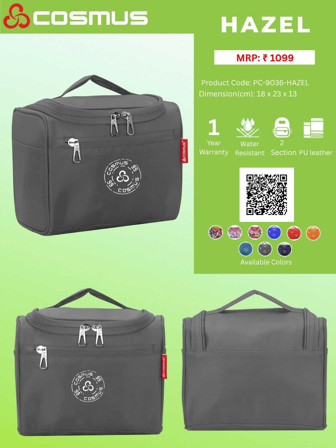 Cosmus BagsHazel Toiletry Bag – Water Resistance Lenin Bag with Multiple PocketsCosmus Hazel is the perfect travel partner accompanied with huge space for your travel essentials one large main compartment to hold your basic normal size travel essentials, a front zipper pocket, and a mesh pocket are convenient for small items like a toothbrush. Separate organized your personal belongs perfectly, so you don't need to throw everything in carry-on no matter the material or size anymore. Get everything safe as the water-resistant fabric keeps everything safe, systematically arrange them so that you know where's what, find everything immediately instead of digging in your bag.SPLITHEREOther FeaturesDimensions: 09.25 x 7.00 x 5.00 inches (WxHxD)Weight: 235 gmMade in India
