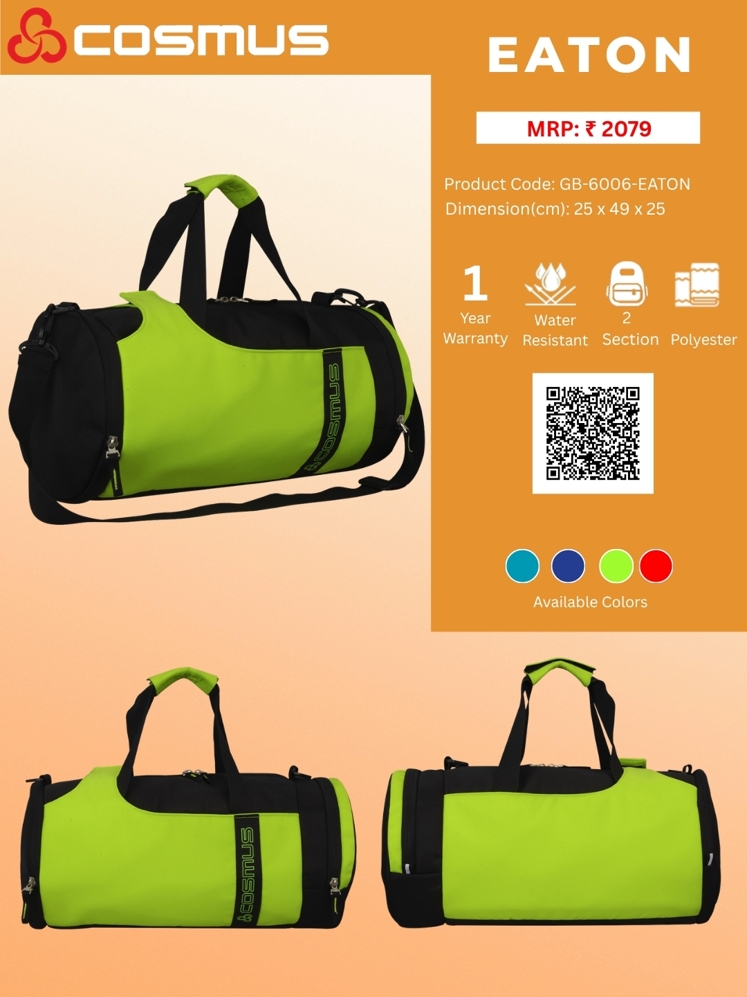 The Cosmus – Eaton duffle bag comes with high-quality metal zippers and fittings with PU coated polyester inside lining makes this duffle bag premium and Strong