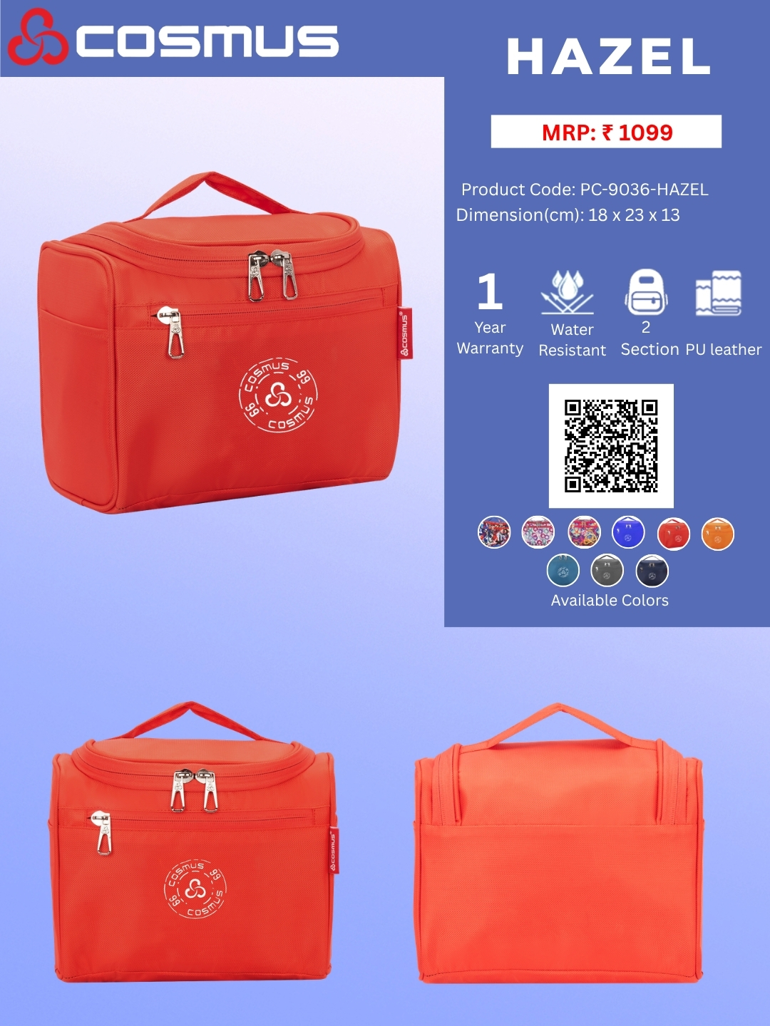 The Cosmus – Hazel creates everything while understanding your needs, it is equipped with 2 zippers and extremely Spacious storage units for your multipurpose use and a back zipper with a side stretchable mesh pouch.