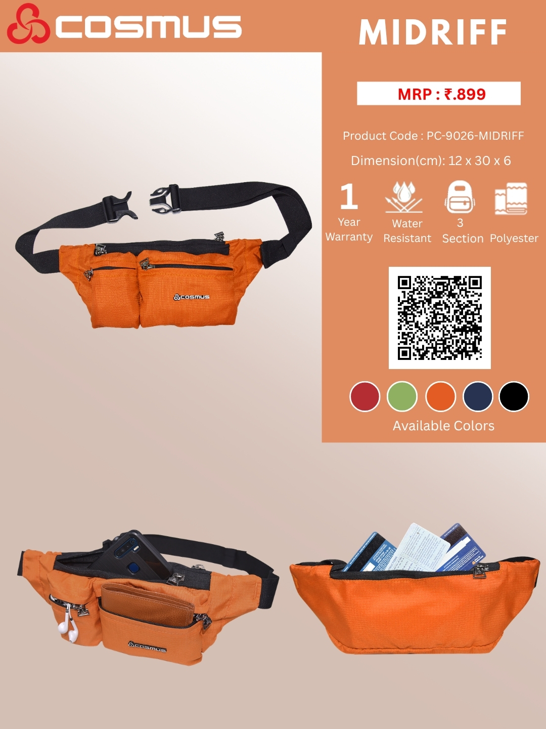 Compact Design yet Spacious: This waist bag is small but well organized. The main zipper pocket is spacious to hold mobile phone upto 6 inches, wallet, etc., and the 2 front pockets are ideal for tissues and earphones, Sanitizer, Mask, the rear hidden pocket is safe for valuables, such as cash, credit card, passport etc.
