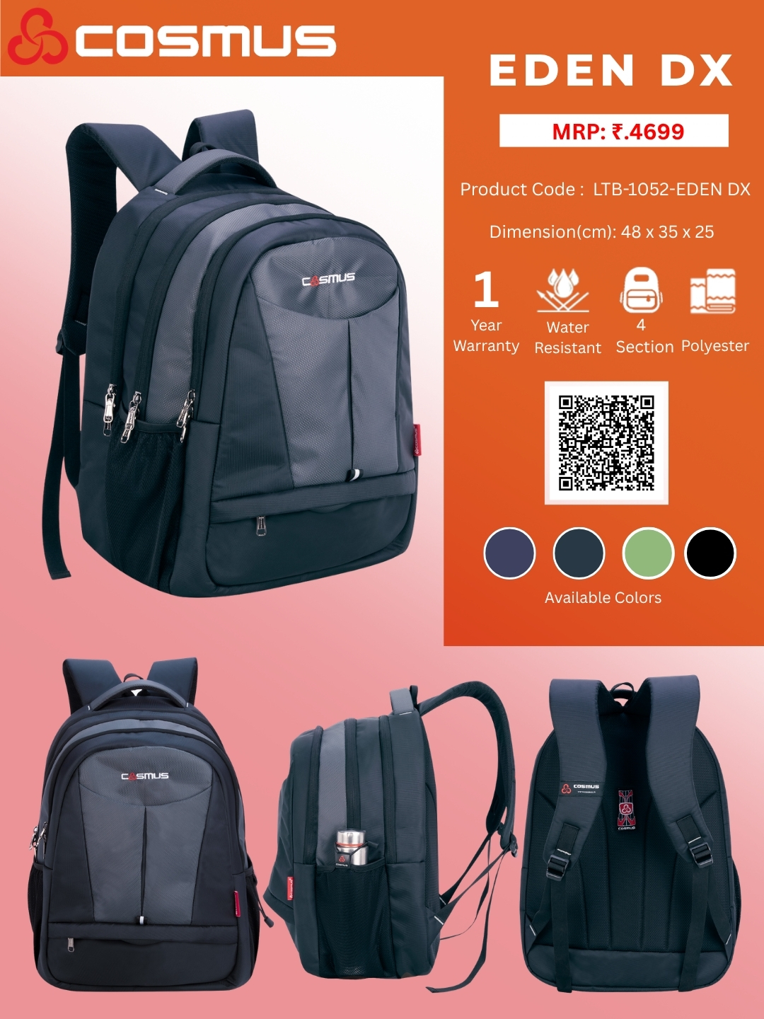 Cosmus Eden Dx laptop backpack is perfect laptop bag for you, its cushioned laptop pocket keep your laptop securely tight and protected while you are on the move. This laptop bag pack suits your style & is very comfortable to carry, its ergonomics and makes you forget the load you are carrying, well-padded shoulder straps ease the carrying