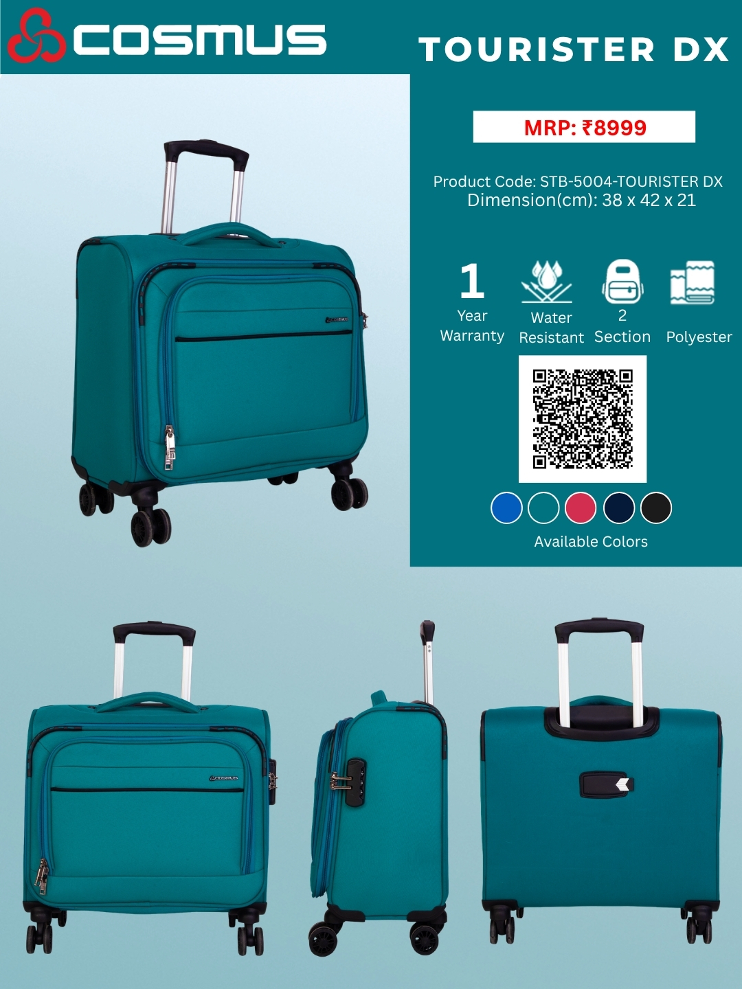 The stylish & spacious COSMUS Polyester Overnighter Laptop Trolley Bag comes with an Adjustable Trolley Handle & Laptop compartment functionality, making it super compatible as cabin luggage and perfect for business trips.