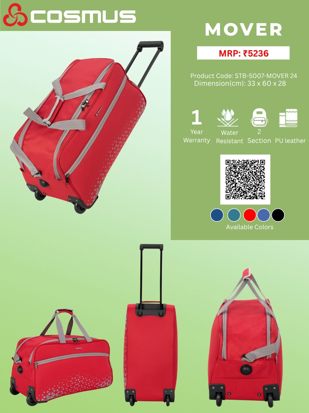 Three Convenient way of carrying, retractable trolley, adjustable shoulder and Quick grab cushioned long handles.