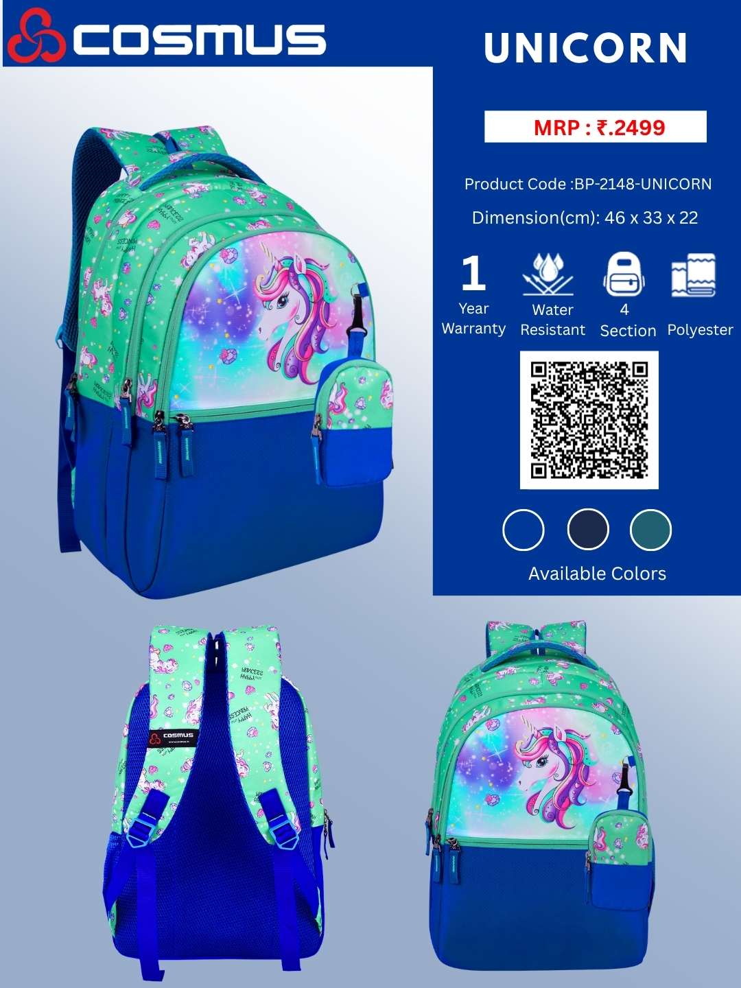 Fashionable Design: The Cosmus UNICORN Royal Blue 32-liter Girls School Backpack boasts a trendy color and sleek design, making it a stylish accessory for students who value both fashion and functionality.