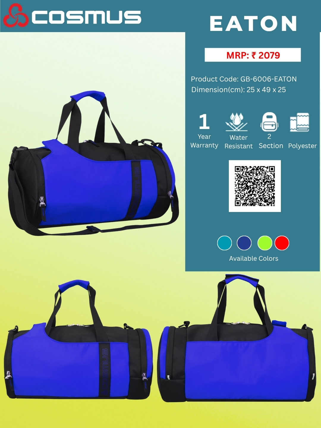 The Cosmus – Eaton duffle bag comes with high-quality metal zippers and fittings with PU coated polyester inside lining makes this duffle bag premium and Strong