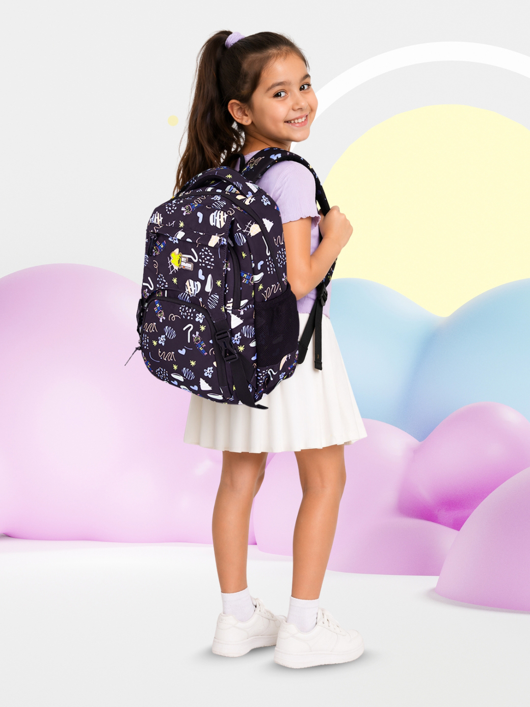 Bright, cheerful purple with multi-color doodles appeals to both boys and girls – fantastic for siblings, friends, or matching school vibes!